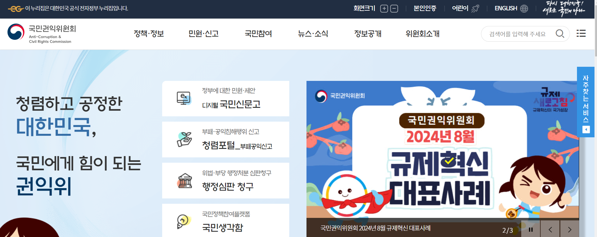 행정 및 공공서비스 관련 민원과 고충을 처리하는 기관으로, 다양한 법률 문제에 대한 상담 서비스를 제공합니다. 국민신문고를 통해 법률 관련 질문을 제출할 수 있습니다.