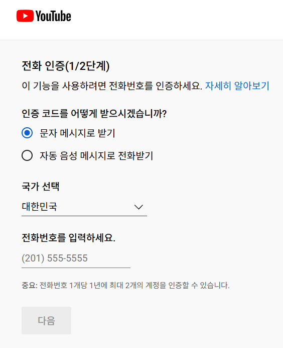 (즉, 같은 번호로 1년에 6번까지만 다른 유튜브 계정 인증에 사용 가능)