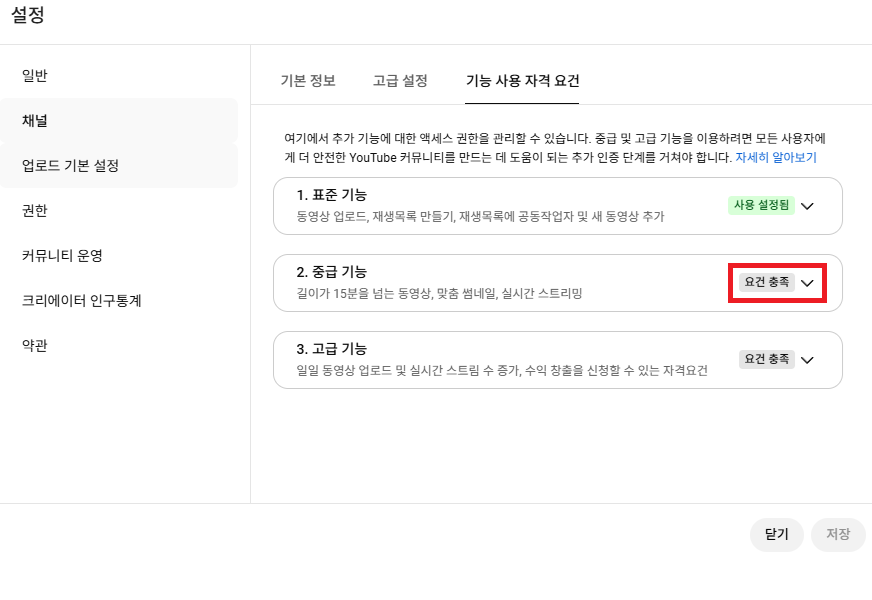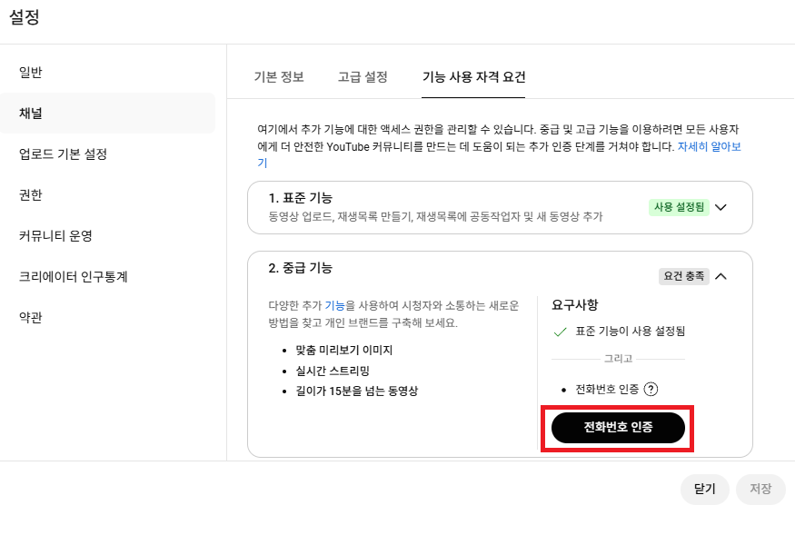여기서 “맞춤 썸네일, 15분 이상 영상 업로드” 등 제한된 기능이 표시됨
